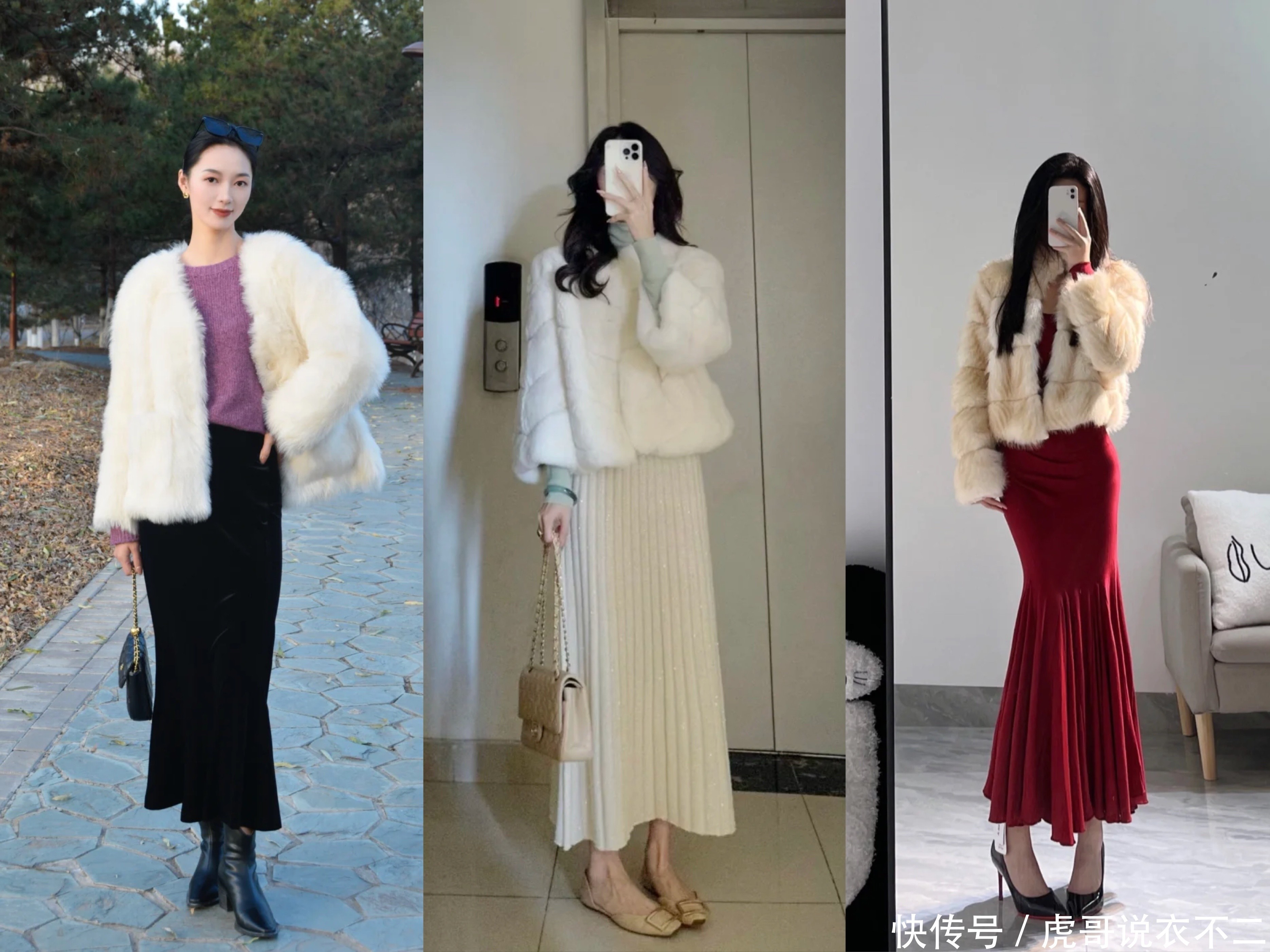没有人能拒绝毛绒绒的皮草外套,羊羔毛、羊剪绒、皮毛一体等外套,贵气十足,而且保暖性也超强,搭配优雅又不失性感的鱼尾裙,绝对是冬季街头的一大亮点,推荐选择白色款毛绒外套哦!