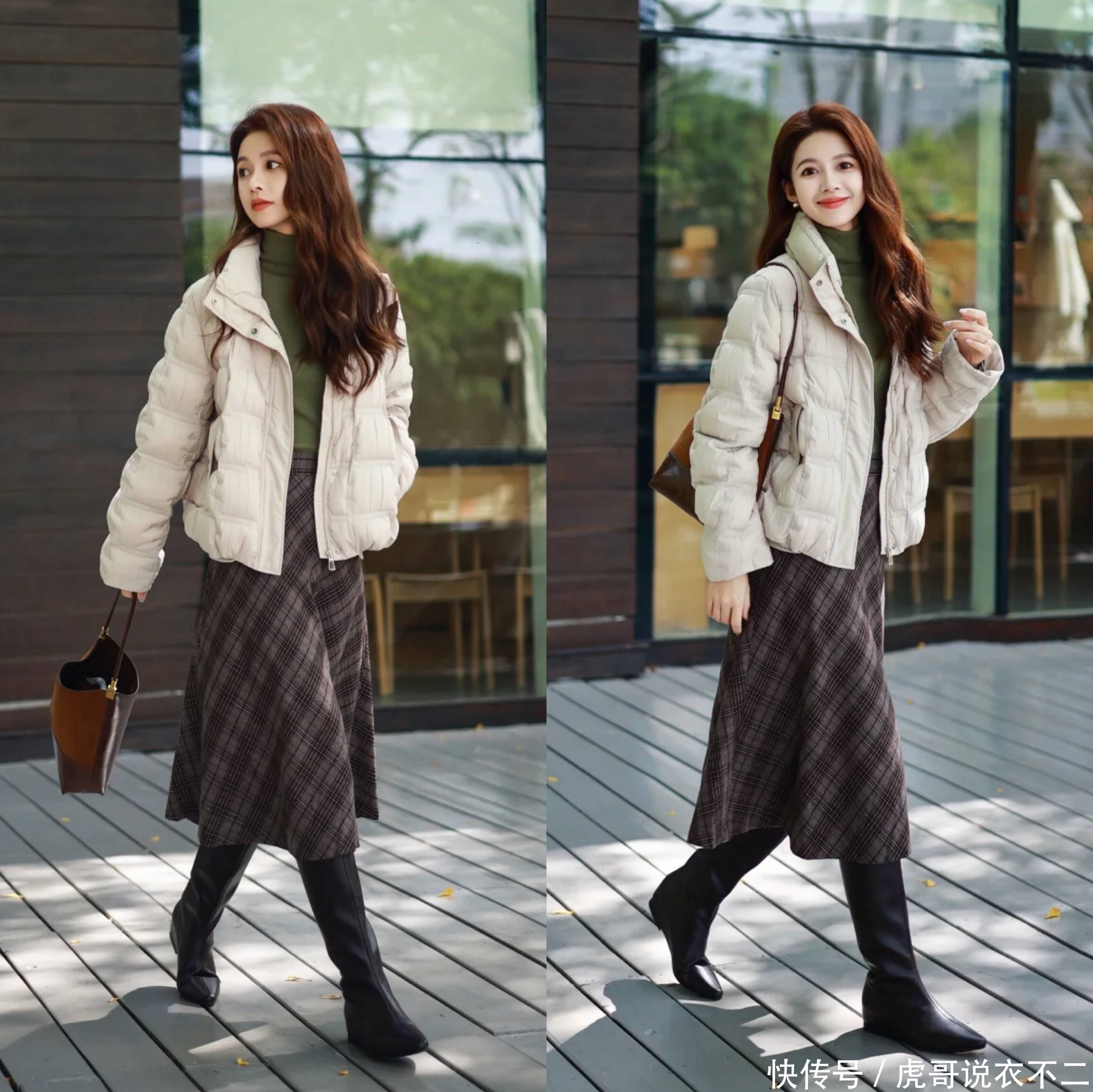 格纹毛呢半身裙,经典复古又不失质感,棕色的格纹极具优雅气息,搭配黑色长筒靴,上半身选择搭配白色短款羽绒服内搭绿色高领衫打底,冬季轻熟风穿搭,同样也是氛围感十足。