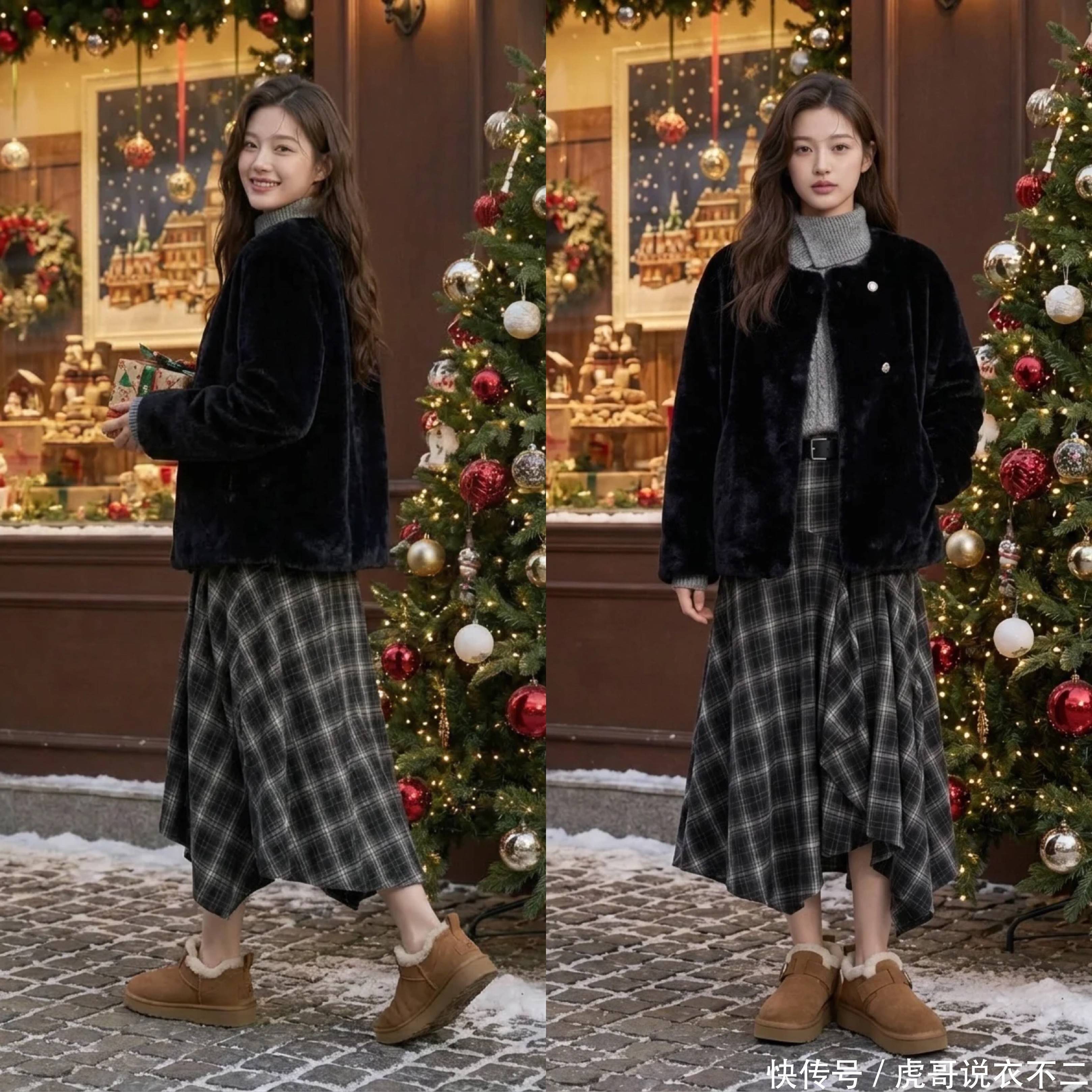 格纹元素是非常复古且不会过时的经典元素,黑色毛绒短外套,内搭灰色高领打底,下半身搭配不规则格纹半身裙,选择羊毛材质,保暖又时尚,搭配棕色雪地靴,打造秋冬温柔又复古的氛围感穿搭。