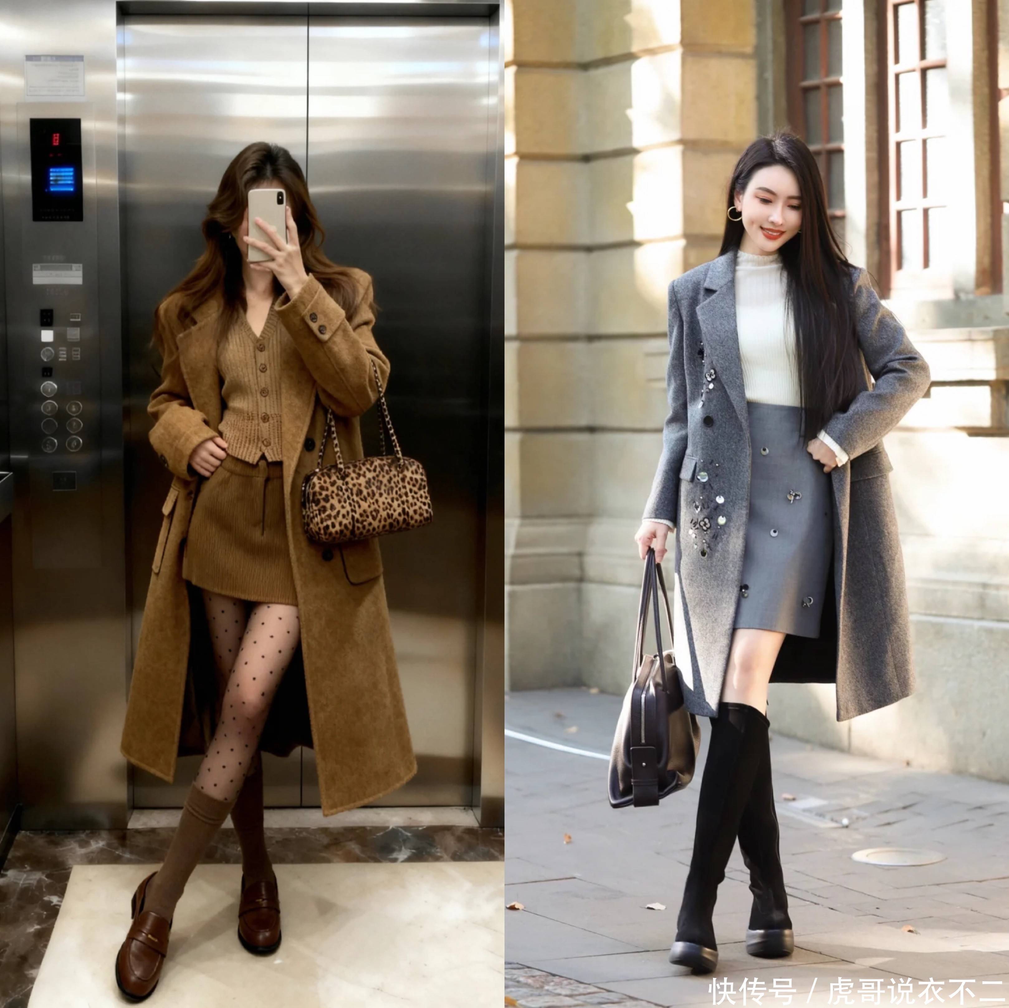 长款大衣配短裙,外长内短的穿搭法则,绝对是冬季打造好身材的绝佳组合,通常推荐单品组合,长大衣,内搭修身打底,高腰短裙+丝袜/打底裤+长筒袜或者长筒靴,视觉对比下,真的超级显腿长。