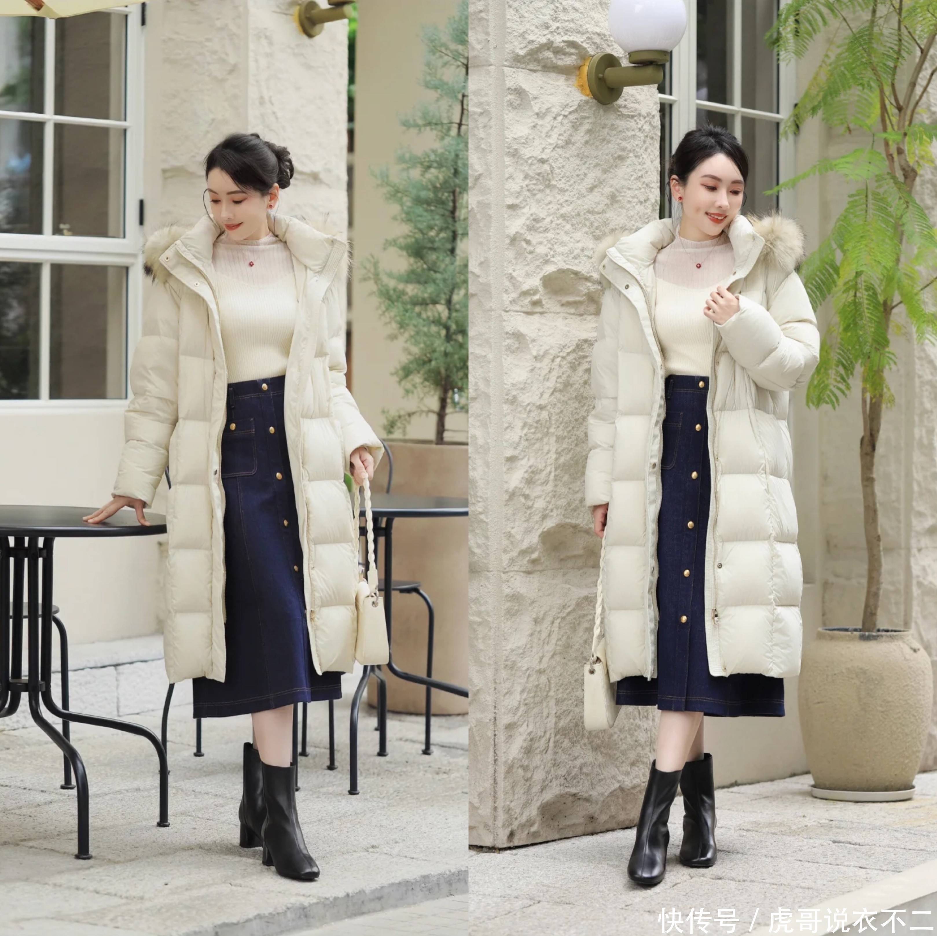 而长款羽绒服搭配半身裙也有非常好的效果,米色长款羽绒服内搭白色修身打底东南配资,下半身选择高腰牛仔半裙+黑色短裙,外松内紧的穿搭,丝毫不会显得臃肿,而且非常的显身材。