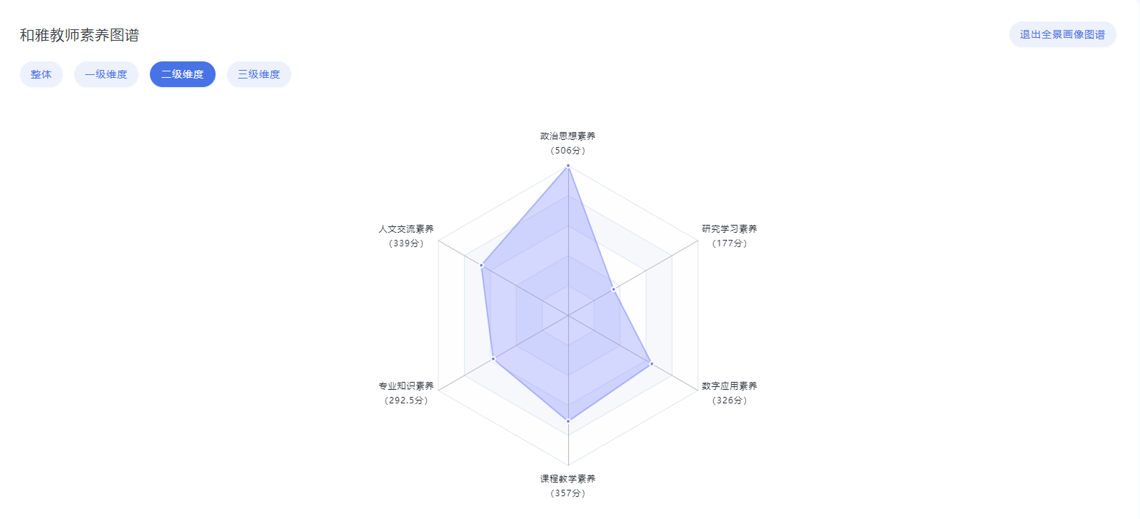 登陆系统后,教师们拿到的“数字画像”形状各异:有的像枫叶,有的像蝴蝶……袁野的“数字画像”则近乎一个完整的六边形,被同事调侃为“六边形战士”。然而,这幅画像却让她感到意外——教龄12年、拿过不少课题奖项、自认是“研究型教师”的她,系统显示其“研究学习素养”竟是她六维能力中最弱的一环。