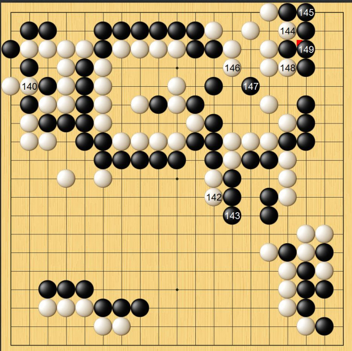 黑棋在左上角寻找到比较丰富的劫材,这个劫打得游刃有余。到黑第145手,王星昊粘了,此时白棋胜率仅剩4.5%。