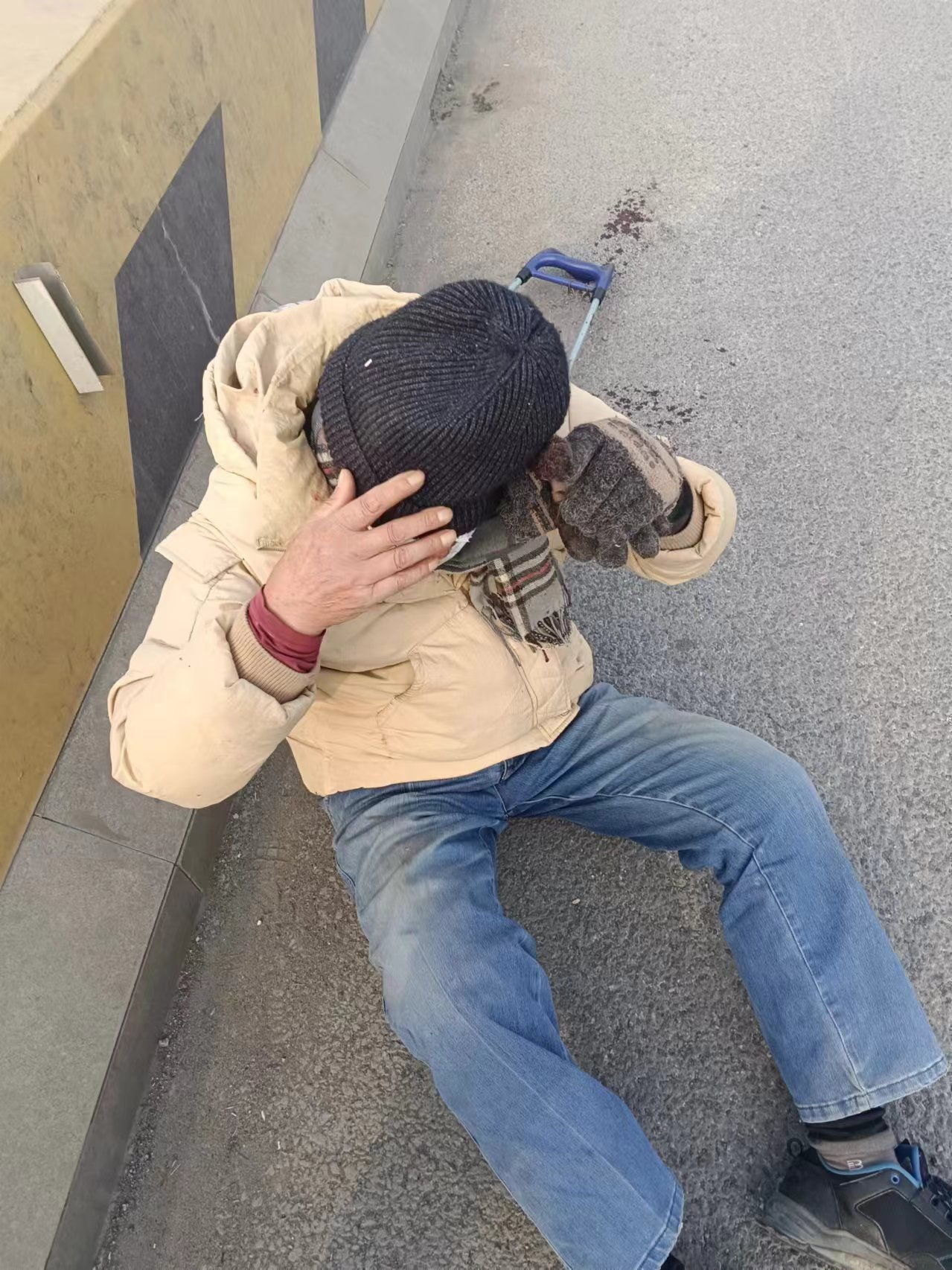 老人趴在路边,面部受伤流血